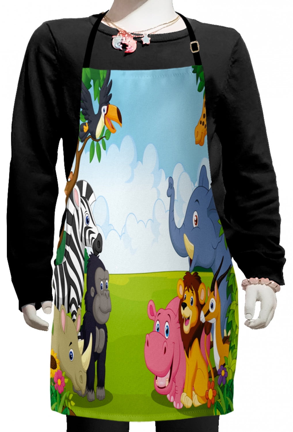 Animal Kids Apron, Kids Design Children Nursery Room Safari Themed Cartoon Animals Image Artwork Print, Boys Girls Apron Bib with Adjustable Ties for Cooking Baking Painting, Multicolor, by Ambesonne Mississippi